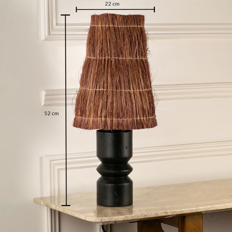 This lamp features a solid wooden base, providing durability and a natural aesthetic. The lampshade is made from high-quality jute that adds a rustic, organic touch, making it a unique statement piece.