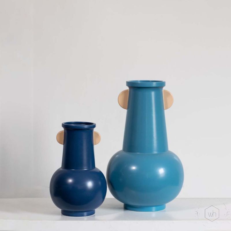 Blue sculptural metal vase grouped with contemporary decor pieces creating a stylish cohesive modern display.