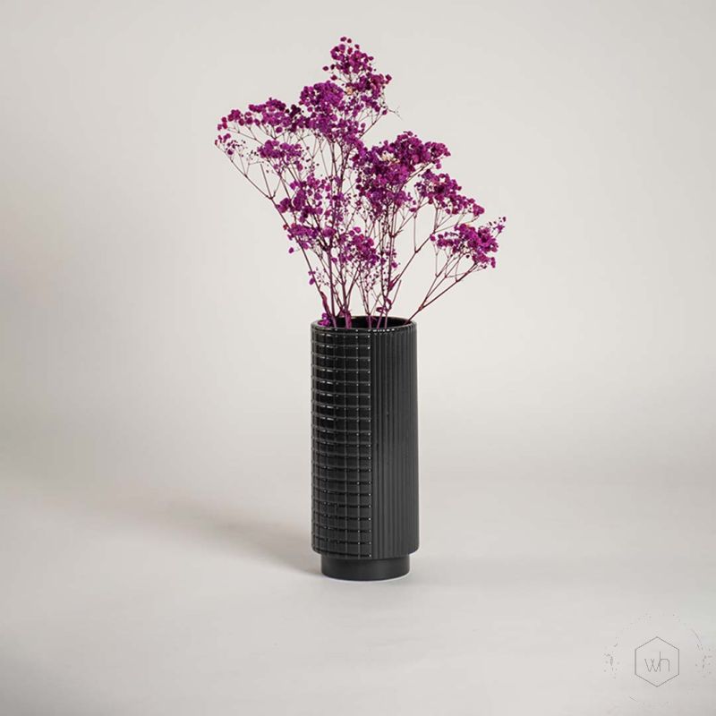 A classic cylindrical silhouette with a glossy ceramic matte finish, the Nuru ceramic vase is an absolute epitome of minimalism and simplicity. The chic black shade makes it a perfect pick to add dark cozy vibes to your interior palette. It is embossed with symmetrical vertical lines running all over the body from top to bottom..