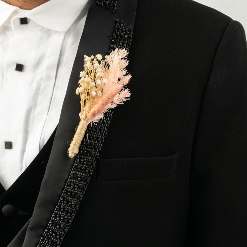 Eye-Catching Accessory: This dried flower boutonniere adds a unique touch to any special occasion outfit.