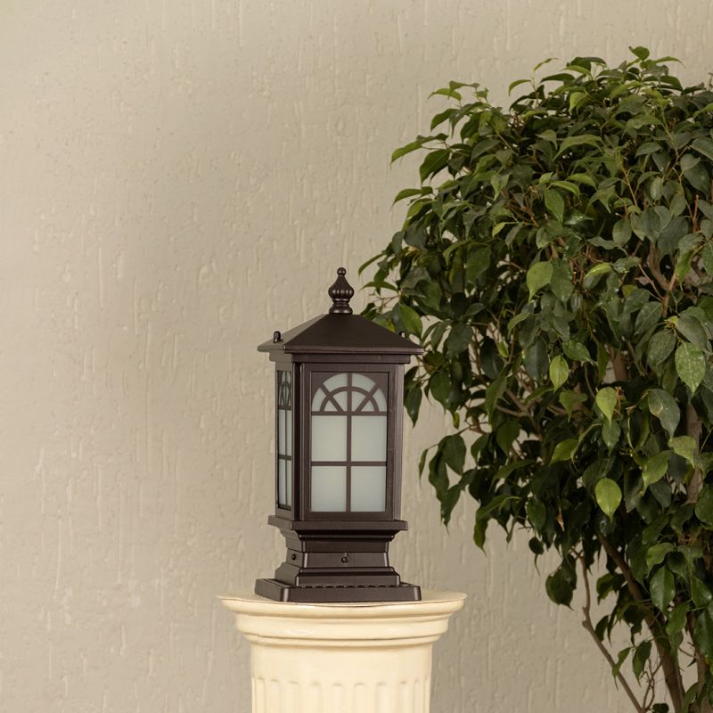 This elegant lantern showcases an arched window grid design on its panels, casting a warm ambient glow through frosted glass. Perfect for enhancing outdoor pillars or entryways with timeless sophistication.
