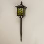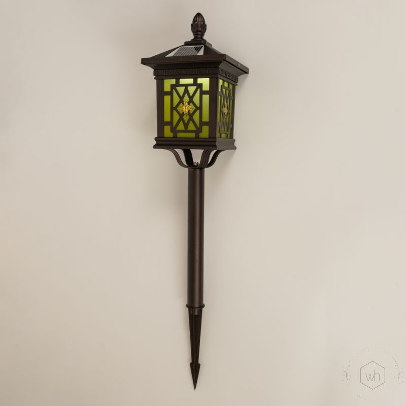 Design: A pillar spike lamp with a sleek brown finish and glass panels for warm, soft lighting.