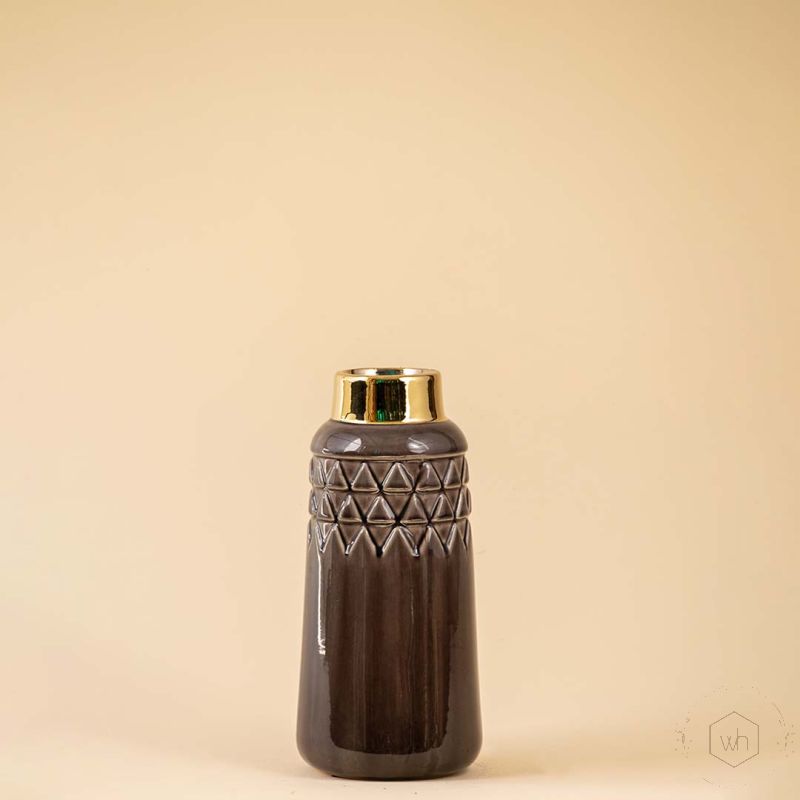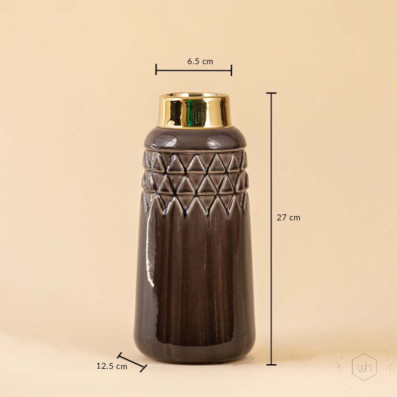 This vase is crafted from high-quality ceramic with a glossy plum brown finish and gold detailing, adding an elegant touch to any decor.