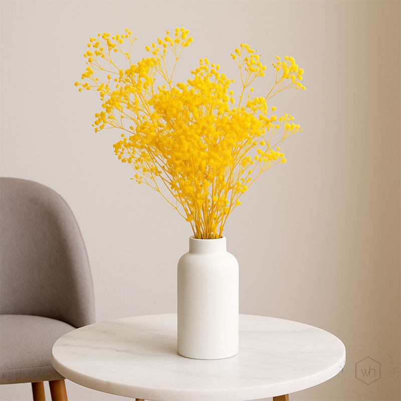 This radiant bunch of preserved Baby’s Breath brings sunshine indoors with its vivid yellow color and airy structure. The product video highlights its delicate details through zoom-in and zoom-out movements—perfect for adding a cheerful, modern twist to dried arrangements or minimalist decor.