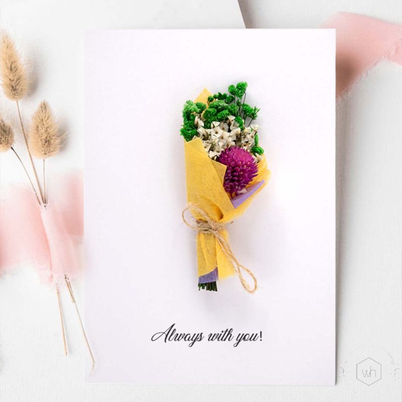 To preserve its charm, keep the card in a dry place away from direct sunlight and moisture, ensuring the dried flowers remain intact and vibrant for years with proper care.