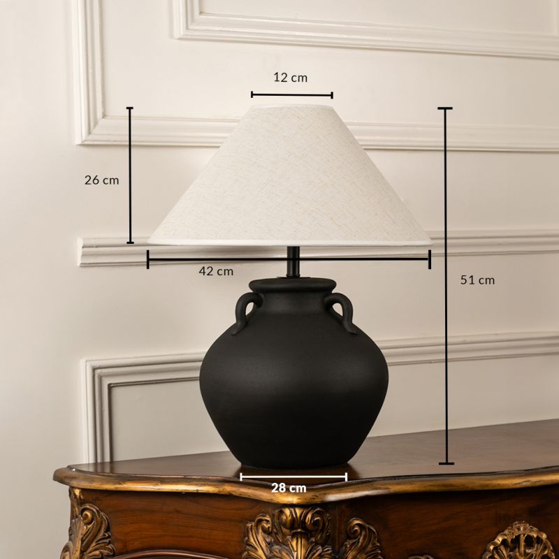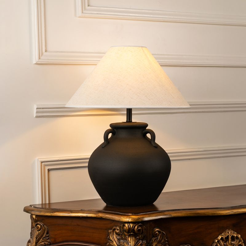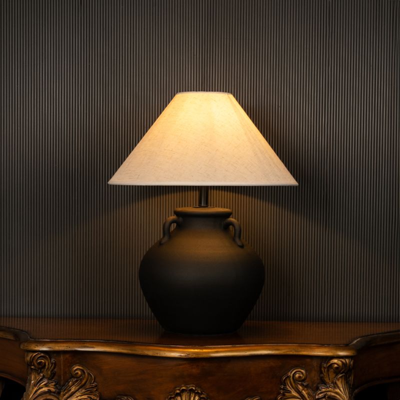 The Radin Table Lamp brings vintage charm and elegance to any room with its unique ceramic pot-like structure. The matte black finish of the base gives it a sophisticated, rustic look, while the white fabric lampshade adds a soft contrast, creating a beautiful balance of style and function. Perfect for enhancing living rooms, bedrooms, or hallways, this lamp is sure to be a standout piece in your home decor.