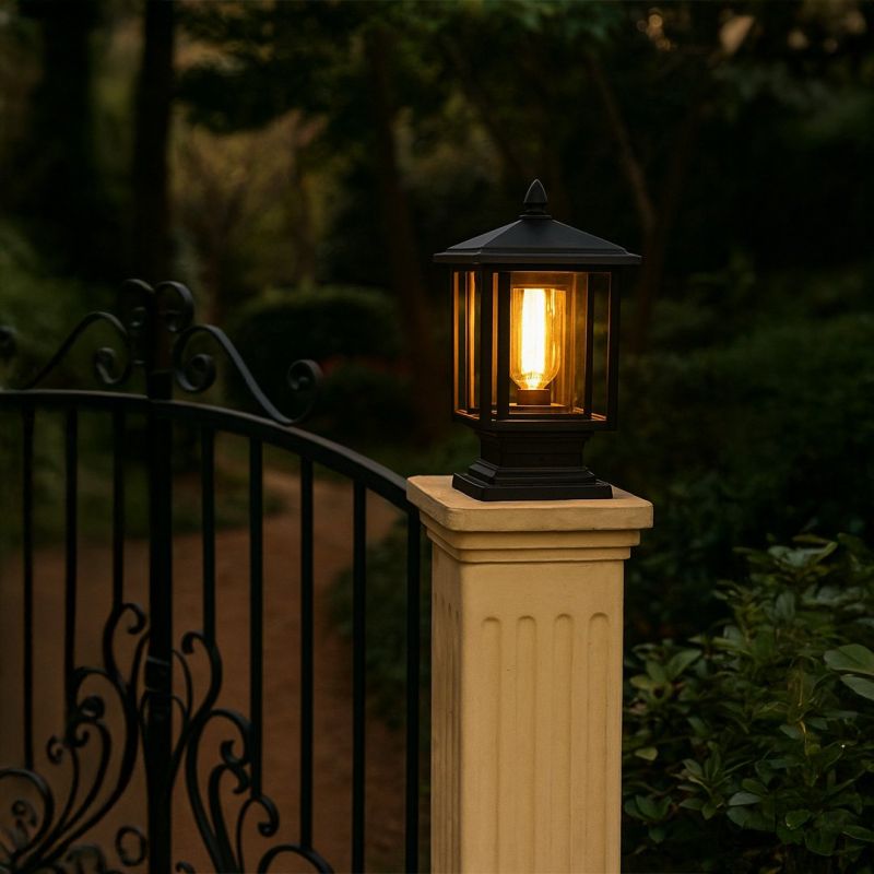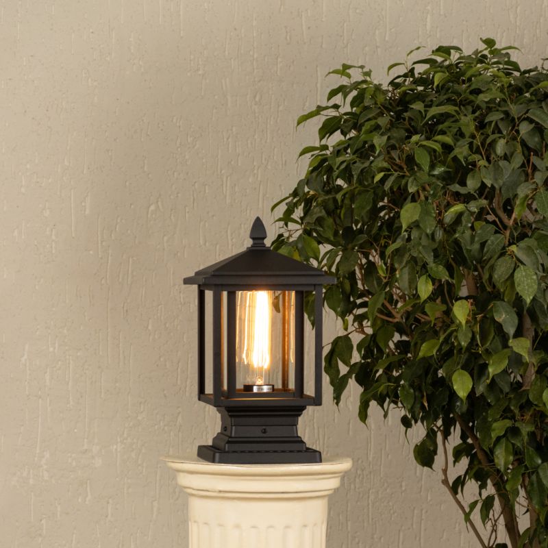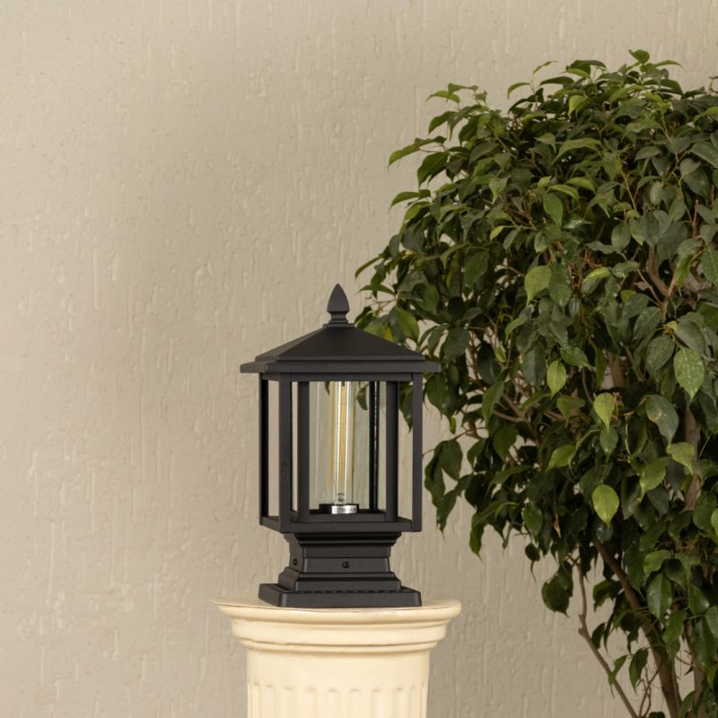 Bring a sleek, architectural touch to your exterior spaces with this matte black pedestal lantern. The clear glass panels and sharp finial top highlight the inner filament bulb, offering both contemporary charm and functional brightness.