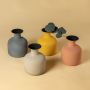 Handcrafted terracotta ceramic vase in rustic brown white finish styled on wooden table with books and wall art decor.