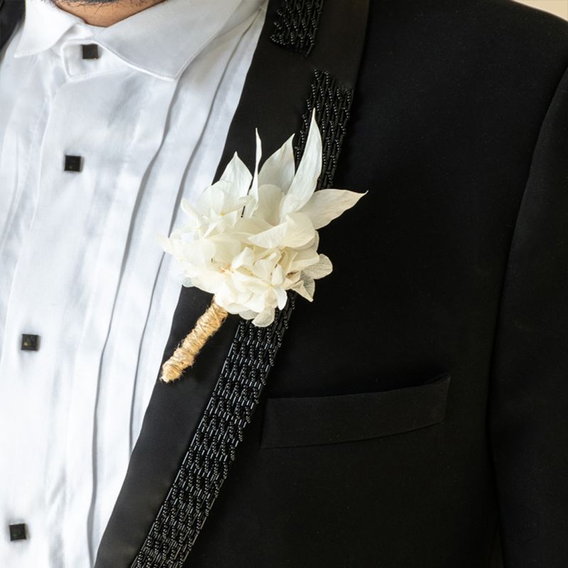 White Magic Boutonniere A trendy accessory featuring white shiny petals, tiny dried grass, and a hint of red. Perfect for adding a touch of elegance to any wedding or special occasion outfit.