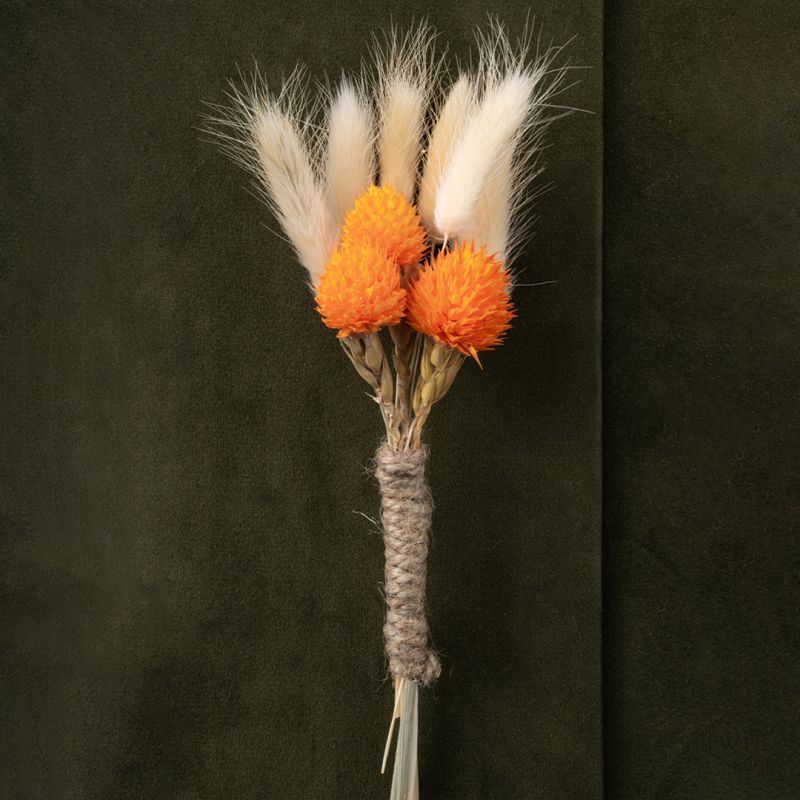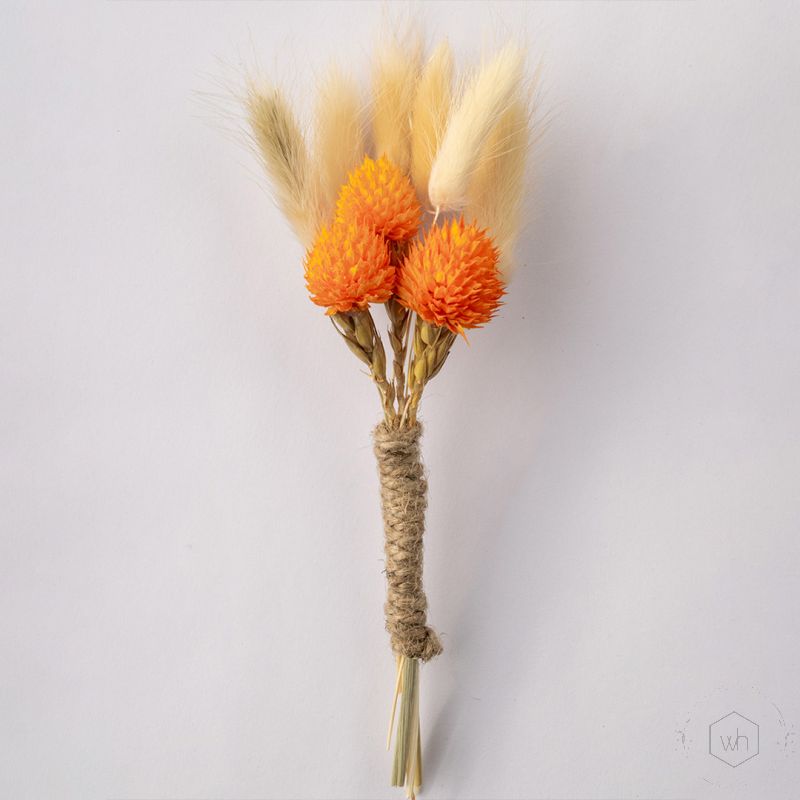 This vibrant boutonniere adds a charming decorative touch, perfect for weddings and parties. Crafted with quality dried botanicals and pampas grass, it radiates lively orange and white shades. Ideal for accessorizing groom and groomsmen's suits.
