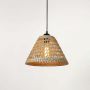 Handmade rattan pendant light with natural woven conical shade displayed on white background for home lighting.