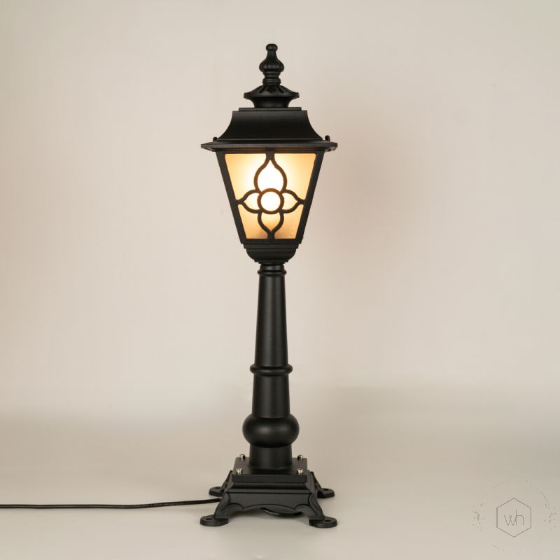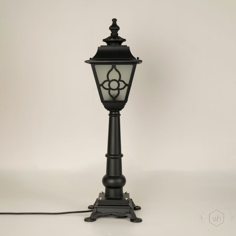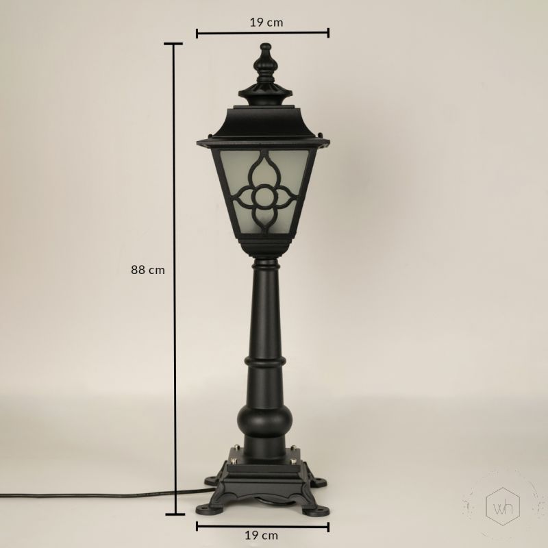 Design: Tall garden pole light with glass panels, delivering a soft, inviting glow