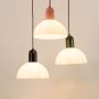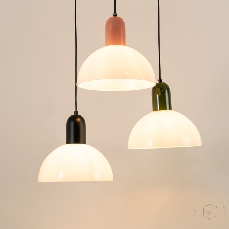 This pendant light blends soft tones with a clean silhouette. The video captures its warm glow as it turns on and off, paired with close-up views that showcase the glossy ivory dome and contrasting olive green top—perfect for adding subtle style to any modern space.