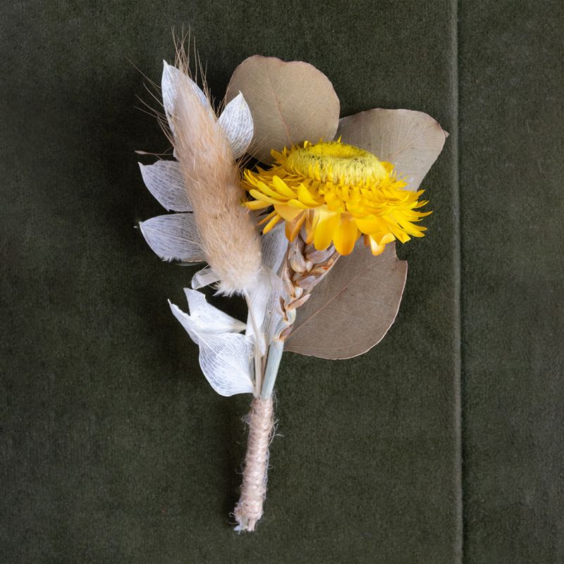 A vibrant bliss! Presenting this beautiful boutonniere created using handpicked quality botanicals. Radiating a soulful mix of yellow, white, and crisp light hues to embrace the lapel of your coat. Featuring cute little sunflowers, soft bunny tails, and dried leaves, it's perfect to complete your look for a special function, gathering, or a wedding. Ideal as a welcome gift for your guests.