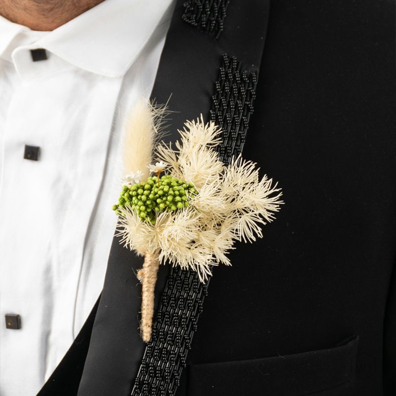 Fresh like snow, this lovely dried flower boutonniere is a timeless accessory that adds a charming touch to any wedding or special event.