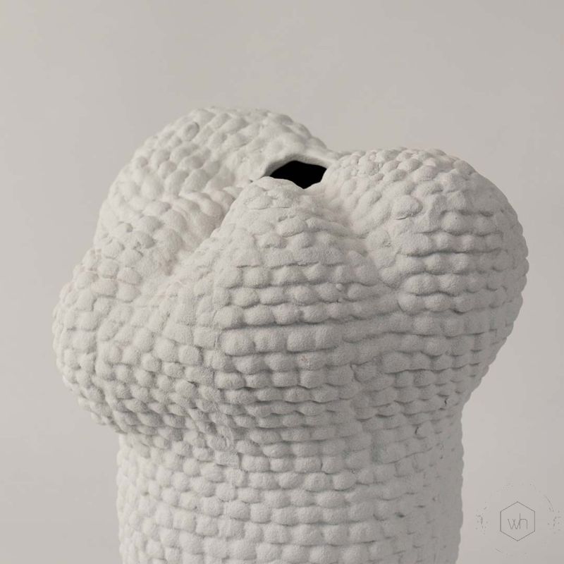 It has a matte, textured finish that gives it a unique, handcrafted feel and enhances its sculptural look.