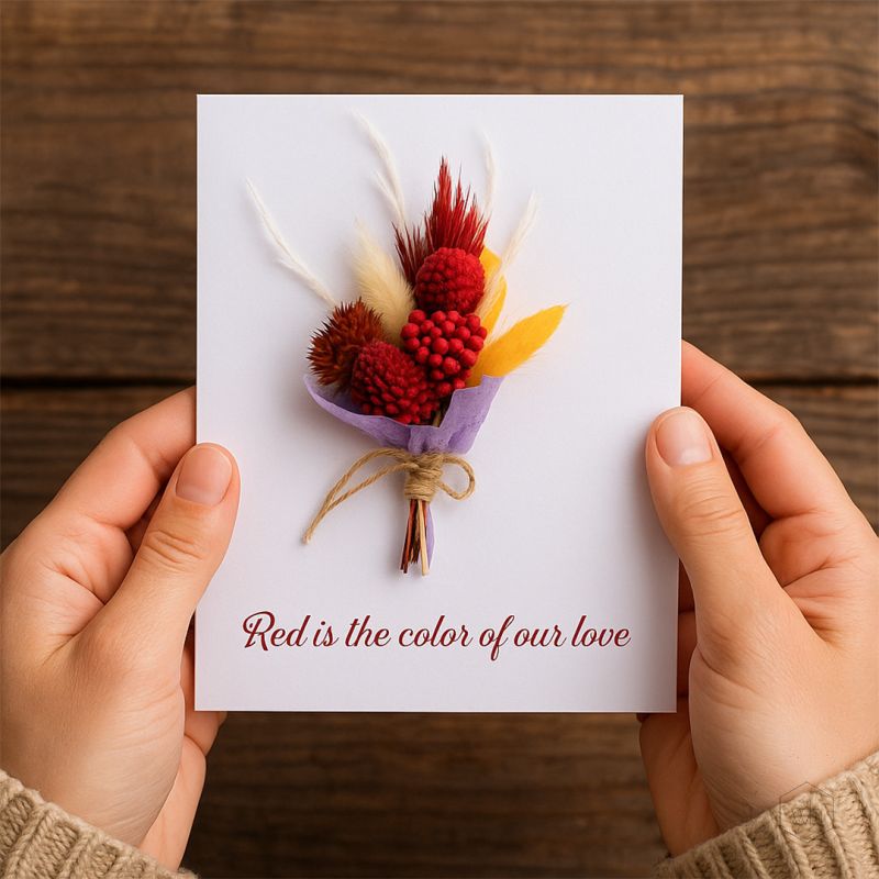 To preserve its charm, keep the card in a dry place away from direct sunlight and moisture, ensuring the dried flowers remain intact and vibrant for years with proper care.