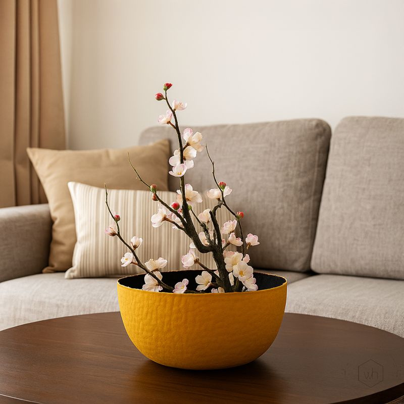 Bold yellow textured metal bowl displayed in a soft neutral scene bringing vibrant modern style to home decor.