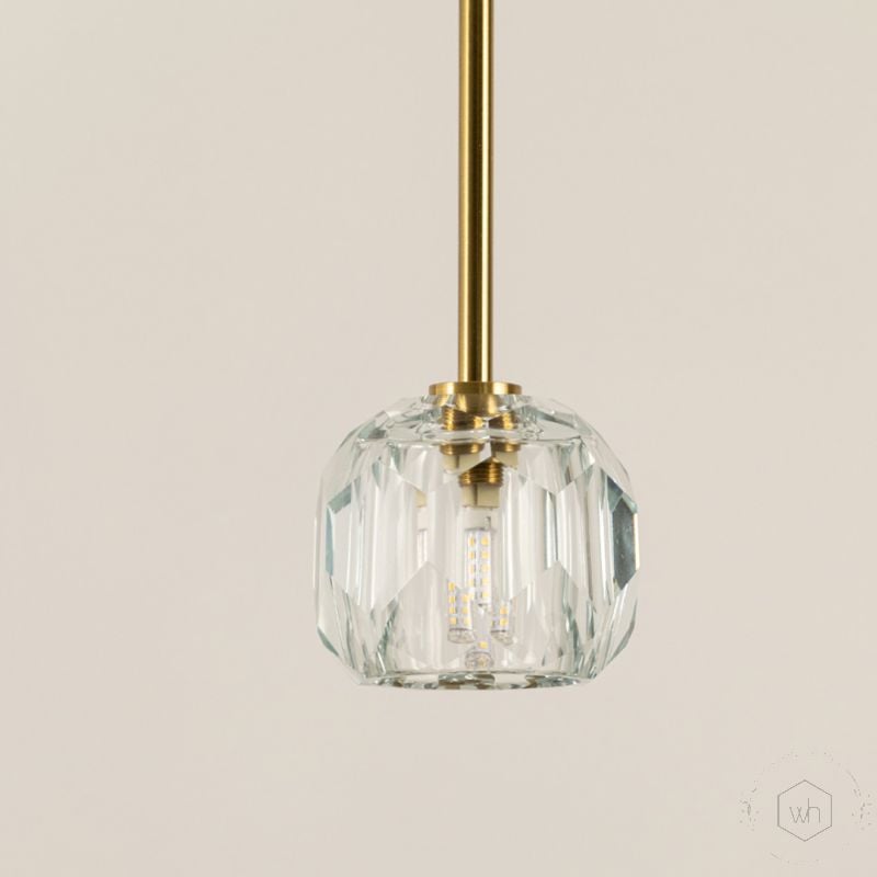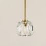 Elevate your lighting design with this dazzling pendant featuring a crystal-cut glass shade and elegant brass detailing. Its faceted surface scatters light beautifully, adding depth and dimension to any room.