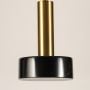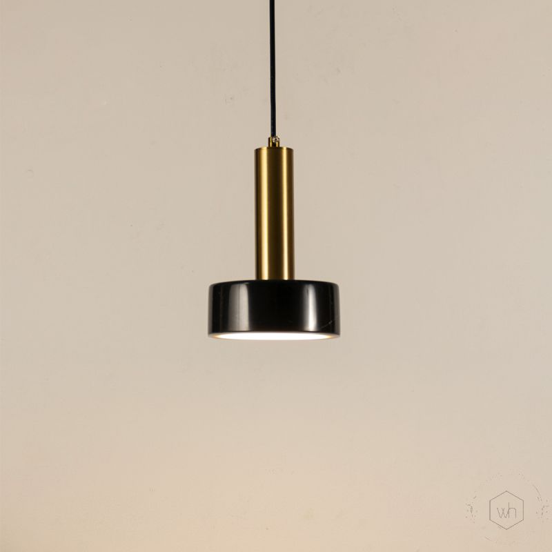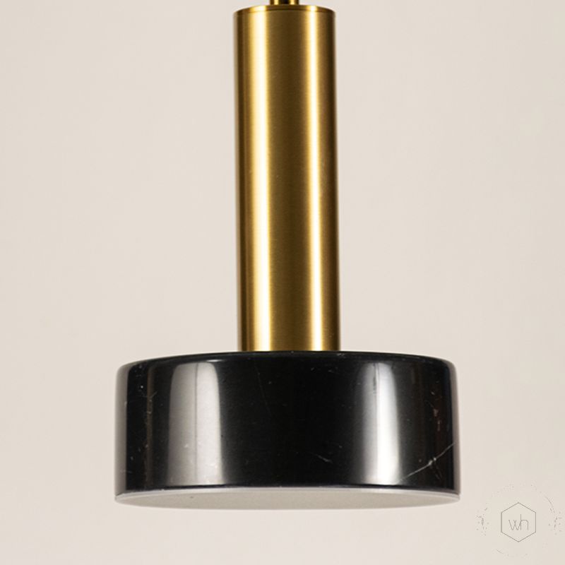 Black marble and metal round base pendant light shown in close up view with light off for modern luxury décor.