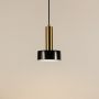 Black cone wall light with brass base glowing warmly on white wall adding industrial elegance to modern interiors.