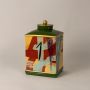Yes, it comes with a matching ceramic lid featuring a round decorative handle for a sophisticated touch.