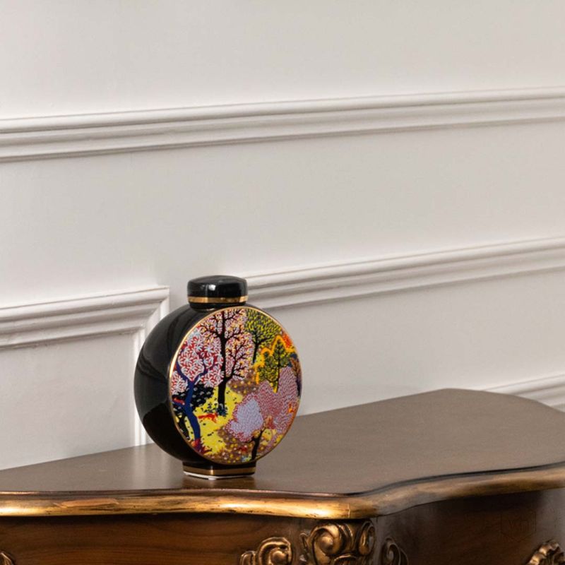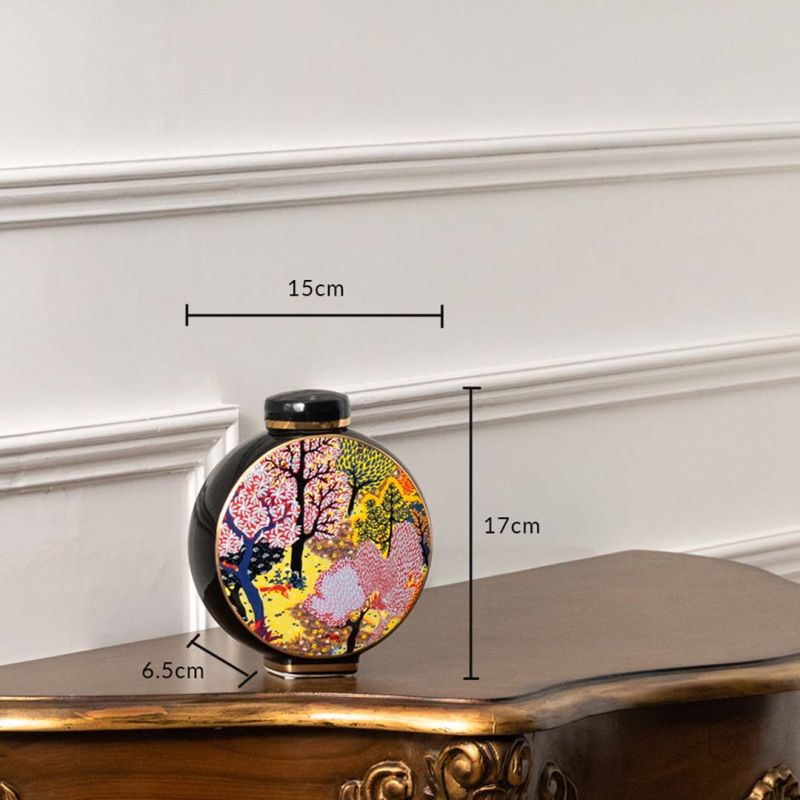Explore the exquisite charm of the Ceramic Tongass Jar, a beautiful blend of traditional Japanese artistry and modern elegance. This jar's smooth, round silhouette with a glossy ceramic finish is adorned with hand-painted caricatures, making it a true centerpiece for any decor.