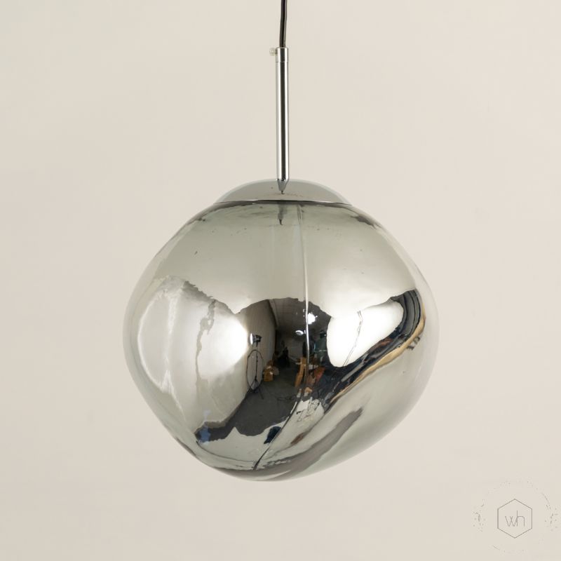 This pendant light typically features blown glass with a reflective chrome finish and a metal rod suspension, blending sleek aesthetics with modern craftsmanship.
