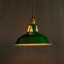 The Vintage Green Shade Pendant Light is a striking lighting fixture with a retro-inspired design, featuring a glossy green finish and golden accents, perfect for enhancing any interior space.