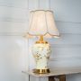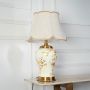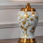 The Wessel Decorative Table Lamp combines a glorious white ceramic finish with handpainted golden floral patterns, showcasing a tall temple jar silhouette.