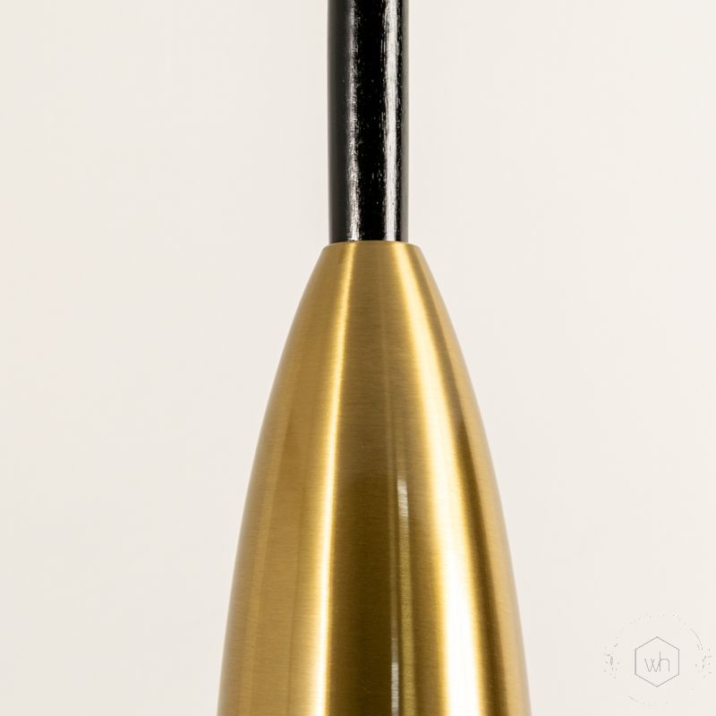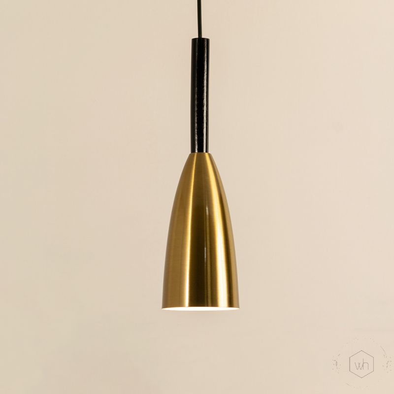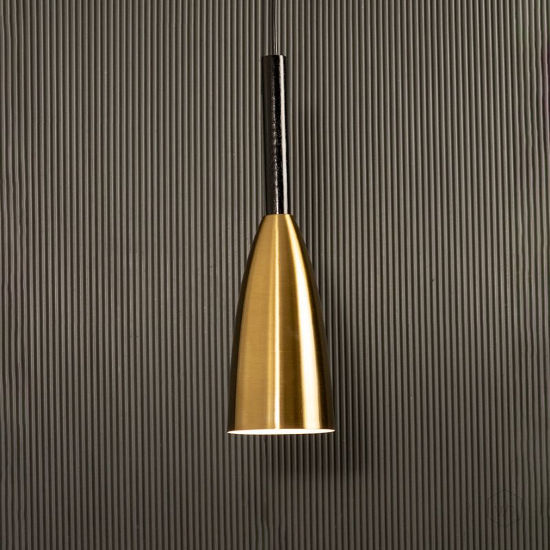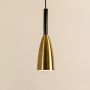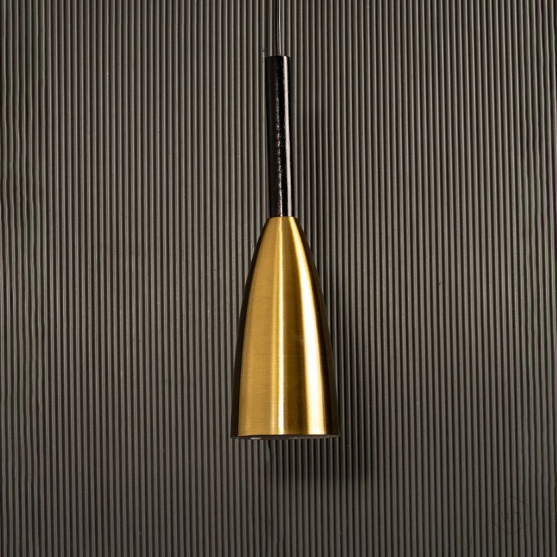 Featuring a slim, elongated brass cone paired with a black suspension rod, this pendant delivers precise lighting with modern edge. Its clean, narrow silhouette makes it a refined choice for accent or task lighting.
