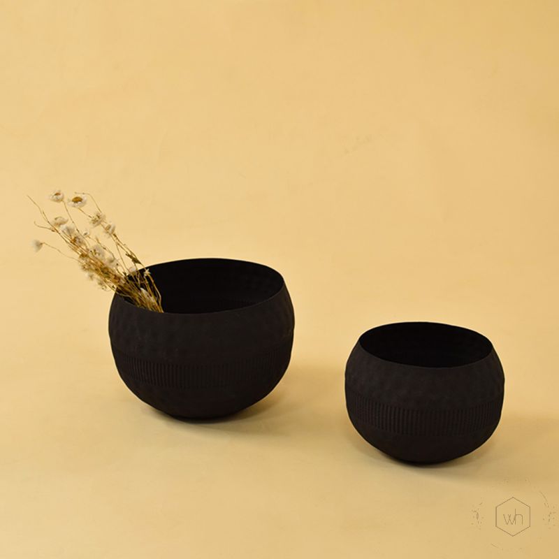 A stunning metal vase black large that echoes the opulence of the Mughal era. Named after the Persian word for "strike" or "coin," Zarb features elegant curves reminiscent of Mughal architecture. Its sleek, monotone surface is adorned with subtle embossed patterns inspired by intricate Mughal metalwork.