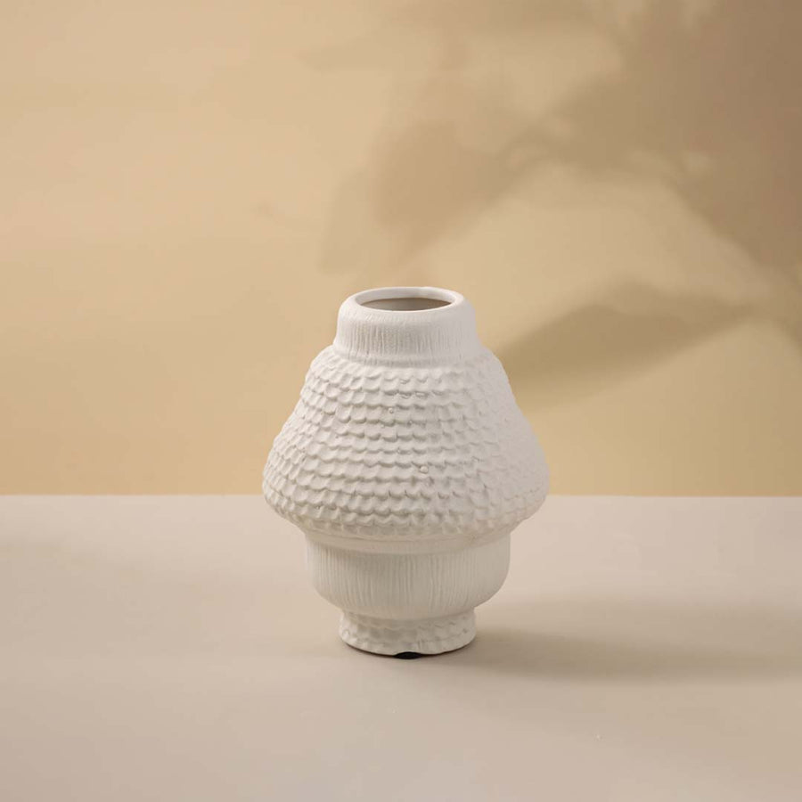 The Atijo White Ceramic Vase showcases a sculptural silhouette with rich layered textures that add depth and elegance. Its matte white finish and artisanal form make it a refined statement for modern interiors.