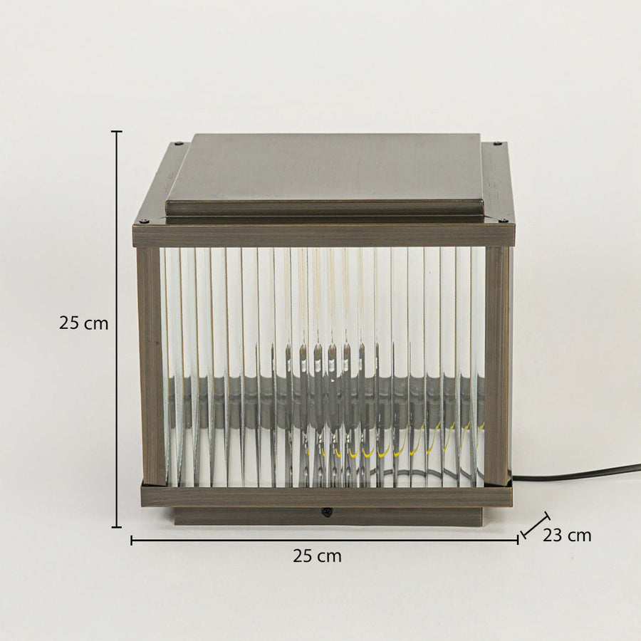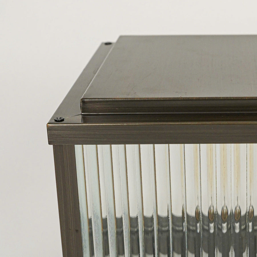 The Box Outdoor Gate Deck Light features a clean rectangular design with a brown aluminium frame and vertically ribbed glass panels, creating a modern structured look that delivers bright and evenly diffused illumination.