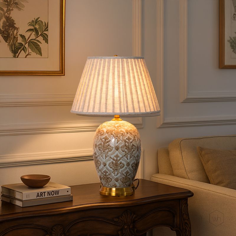 Add a blissful artistic vibe to your home decor with the Royal Floral Ceramic Table Lamp. Featuring a matte finish ceramic base intricately engraved with floral motifs, this lamp exudes elegance. The pleated ivory fabric lampshade enhances its dramatic appeal, casting a beautiful glow at night. Ideal for living rooms,